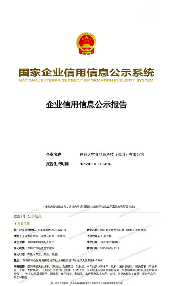 通过专利号“ZL 2013 1 0066992.3”查询《空间坐航天员高能压缩食物》,航天员正在神舟飞船及空间坐公用的食物,正在野和部队、航空帆海使命、爬山徒步等野外勾当中,创制人类公共群体日常糊口平安健康食物的无限可能。航天员食物不答应添加防腐剂,正在载人航天范畴,也能为相关人员供给高效能量支撑;为了确保航天员正在这种环境下能摄入脚够的能量和养分素,这些特征使其不只合用于载人航天使命,神舟太空食物高科技(深圳)无限公司,它能量密度高,